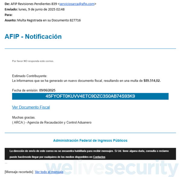 El correo falso le llega a la potencial víctima en nombre de la AFIP (Administración Federal de Ingresos Públicos), actual ARCA, aduciendo que existe una multa registrada a su nombre. El mismo, según ESET, presenta ciertos detalles e indicios que se deben tener en cuenta para comprender que se trata de un intento de phishing y no de un comunicado oficial del organismo encargado de la recaudación de impuestos en Argentina.