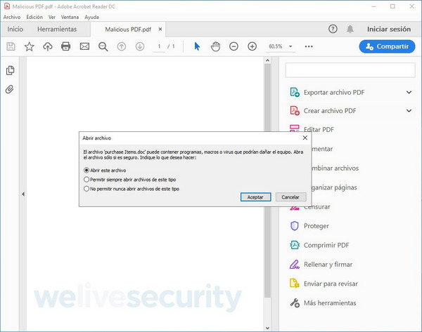 - Si el software con el cual se abrió el PDF muestra algún formulario preguntando si se quiere abrir, ejecutar o activar alguna funcionalidad del documento en cuestión, es probable que este sea malicioso y conviene verificar su legitimidad.