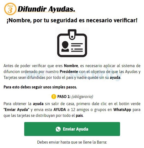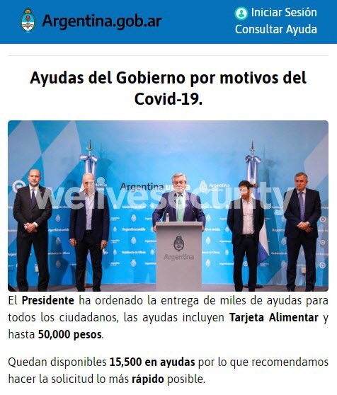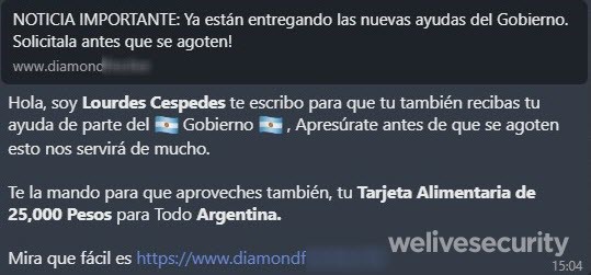 La campaña que continúa activa al día de hoy, busca suplantar la identidad del Gobierno Argentino para ofrecer una supuesta ayuda económica y llega a los usuarios a partir del siguiente mensaje: