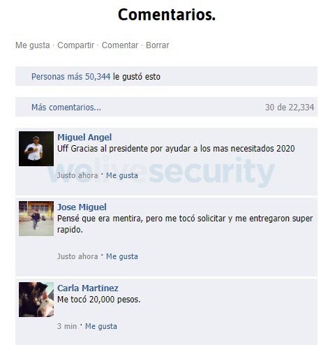 Al igual que en otras campañas de similares características, se utiliza el recurso de mostrar comentarios de otros supuestos beneficiaros de la ayuda con la intención de darle veracidad a la estafa.