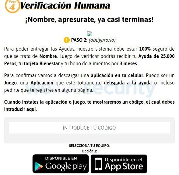 Imagen 6. Instancia en la que solicita descargar una aplicación a través de la cual llegará un supuesto código que deberá ingresar para verificar que es una persona real