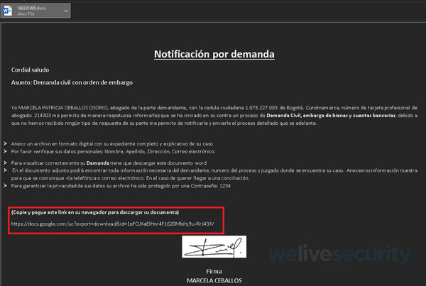 La primera etapa tiene la finalidad de descargar y ejecutar un archivo Batch (archivo de procesamiento por lotes). Esto lo hace por medio del envío de un enlace que se encuentra en el documento adjunto dentro del correo que reciben las víctimas. Este enlace dirige a las víctimas a la descarga de un archivo comprimido, que está alojado en Google Drive y protegido con contraseña. La contraseña para abrirlo se encuentra dentro del mismo correo. Para captar la atención de las víctimas, los cibercriminales utilizan diferentes engaños relacionados con supuestas demandas o procesos judiciales que los usuarios poseen.