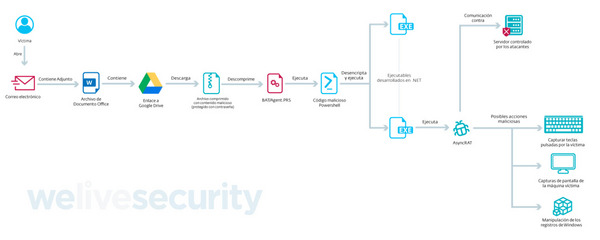 “El objetivo de la campaña era descargar en los sistemas de las víctimas un Troyano de Acceso Remoto conocido como AsyncRAT, que permite a los atacantes realizar remotamente diversas acciones maliciosas en el equipo comprometido. Por ejemplo, acceder a archivos y carpetas, realizar capturas de pantalla, registrar pulsaciones de teclado para robar credenciales o incluso descargar en el equipo malware adicional.”, explica Camilo Gutiérrez Amaya, Jefe del Laboratorio de Investigación de ESET Latinoamérica.