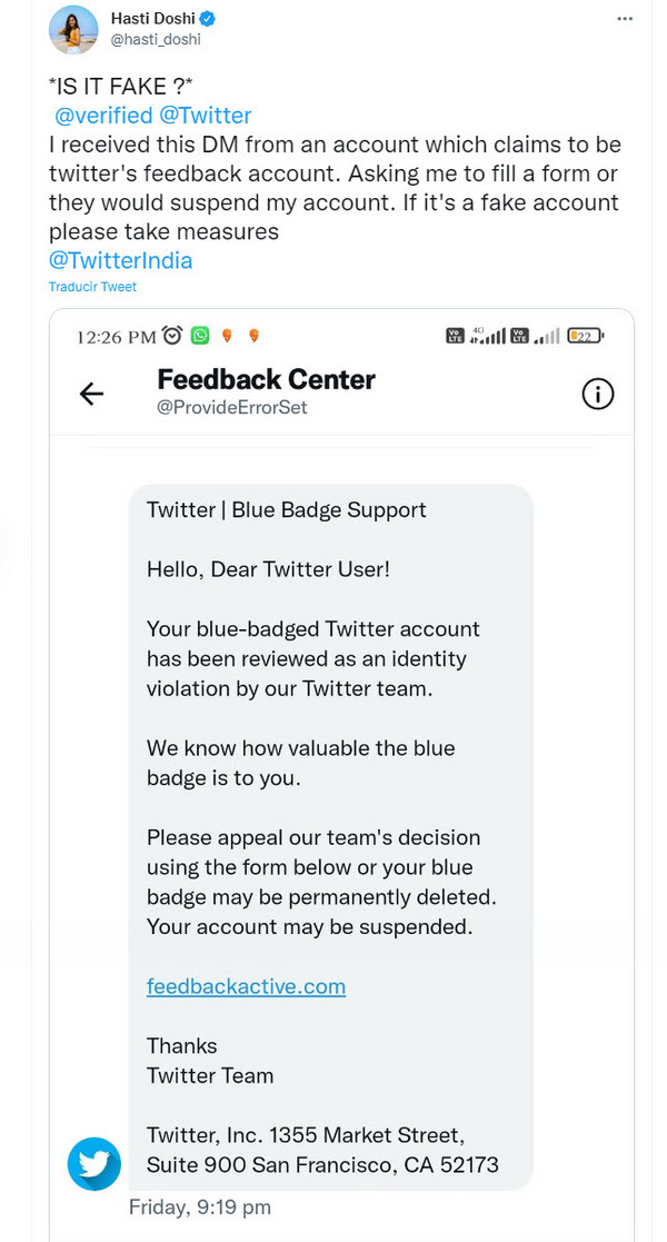 El engaño se basa en que se hacen pasar por una cuenta de soporte oficial. Los estafadores envían mensajes que hacen referencia a una supuesta violación de identidad de la cuenta y mencionan que para evitar la suspensión de la misma y que se borre la marca de verificación, el usuario deberá completar un formulario.
