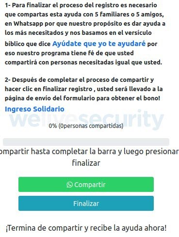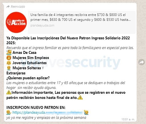 En los últimos días ESET identificó una nueva campaña, que apunta a toda Latinoamérica y utiliza imágenes y contenido de programas reales que existen en países como Paraguay o Perú. Esta nueva campaña dirigida a la región en general promete una ayuda económica para poblaciones que se hayan visto perjudicadas por la pandemia, particularmente a grupos que no suelen contar con ingresos fijos. La distribución de esta nueva campaña también es a través de WhatsApp y busca robar datos personales.