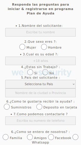 Una vez que la víctima accede al sitio, por recibir el enlace de un conocido a través de una red social, app de mensajería o por haber realizado una búsqueda de la frase “Plan de ayuda”, se le solicita completar una encuesta, similar a la de otras de las campañas fraudulentas.