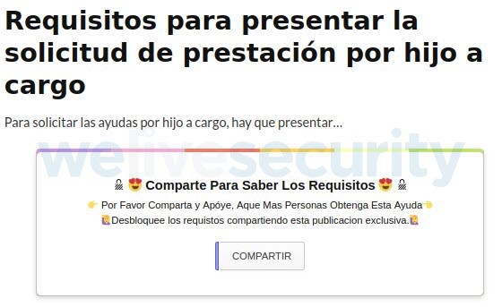 Una vez que la víctima envía los mensajes, el sitio la redirecciona por distintos sitios, para luego finalizar en uno informativo, también propiedad de los cibercriminales, en donde se informa que los beneficios serán depositados en las cuentas bancarias sin más detalles. Sin embargo, el engaño no termina ahí: para recibir un beneficio destinado a padres y madres de familia, se debe compartir la misma estafa vía Facebook, lo cual obliga a la víctima a propagar nuevamente el engaño.