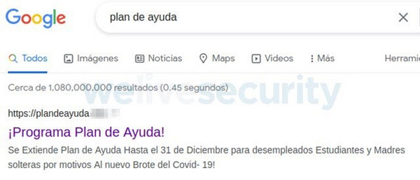 Sin embargo, no es el único método de propagación que utilizan los operadores detrás de esta campaña. Al colocar en un buscador como Google “Plan de ayuda” se encuentra posicionado en el primer resultado un sitio apócrifo falso con la intención de captar víctimas desprevenidas.