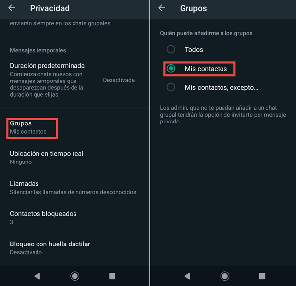 Aunque se haya eliminado el grupo el delincuente pudo haber tomado una captura de los participantes y usar esa información más adelante. La recomendación de ESET, en este caso, es utilizar la configuración “Mis contactos”, para asegurarse de que solo personas agendadas puedan agregar a un grupo.