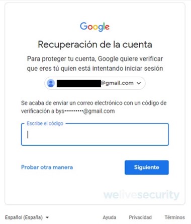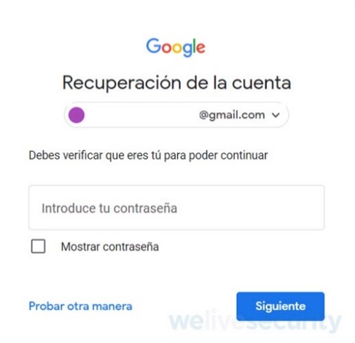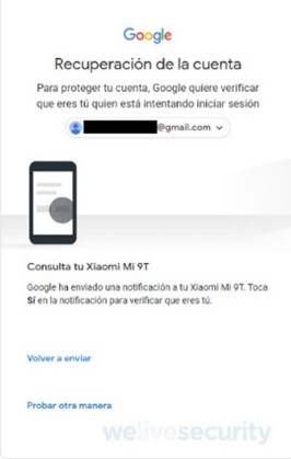 Si efectivamente no se puede recuperar la cuenta de Gmail ya que la contraseña ha sido vulnerada y modificada; es muy probable que aemás el cibercriminal haya modificado los otros medios de recuperación. Sin embargo, existe una posibilidad de recuperar la cuenta: si en el dispositivo móvil aún se tiene configurada la cuenta de Gmail como cuenta principal. De ser así, ingresando al centro de recuperación, se indica cuál es la cuenta de Gmail a recuperar y se selecciona “Siguiente”. También se ingresa la última contraseña que se recuerde haber ingresado. Luego, a pesar de ingresar una contraseña que no sea correcta (ya que el cibercriminal la modificó) se brinda la opción de verificarlo a través del dispositivo configurado como segundo factor de autenticación.