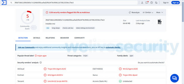 El equipo de ESET analizó los archivos que se descargan mediante esta ruta y, revisando los resultados de Virustotal, se puede observar que se trata de un instalador (archivo MSI) que es detectado como contenido malicioso por soluciones de seguridad como las de ESET. Este tipo de detección está relacionada con códigos maliciosos que derivan en la instalación de adware, que llenarán el dispositivo de publicidad en popups y redirigen a sitios maliciosos, incluso llevando a la descarga de malware más peligroso.