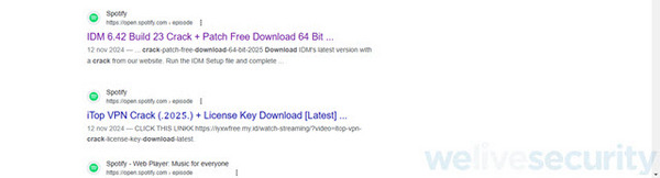 Como se puede observar en la siguiente imagen, al realizar una búsqueda en Google sobre un crack específico, aparecen resultados que llevan directamente a Spotify, e incluso a un link para descargar una versión pirata de esta app: