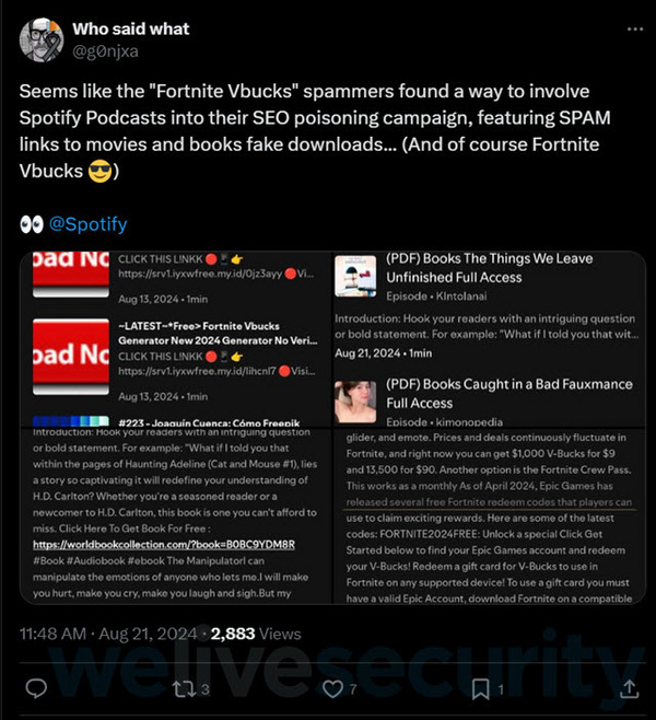 Hace unas semanas, distintos usuarios de la red social X reportaron otros ejemplos de este tipo de distribución, donde detectaron enlaces maliciosos en la descripción de varios podcasts en Spotify. Los enlaces simulan ser links para descargar audiolibros o material pirata similar.