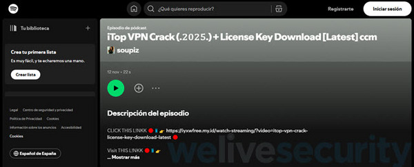 Al ingresar al link de la supuesta descarga del crack para iTopVPN, este lleva a un podcast que tendrá en su descripción varios links que conducen a la descarga del supuesto crack del software prometido alojado en un popular servicio de almacenamiento en la nube.