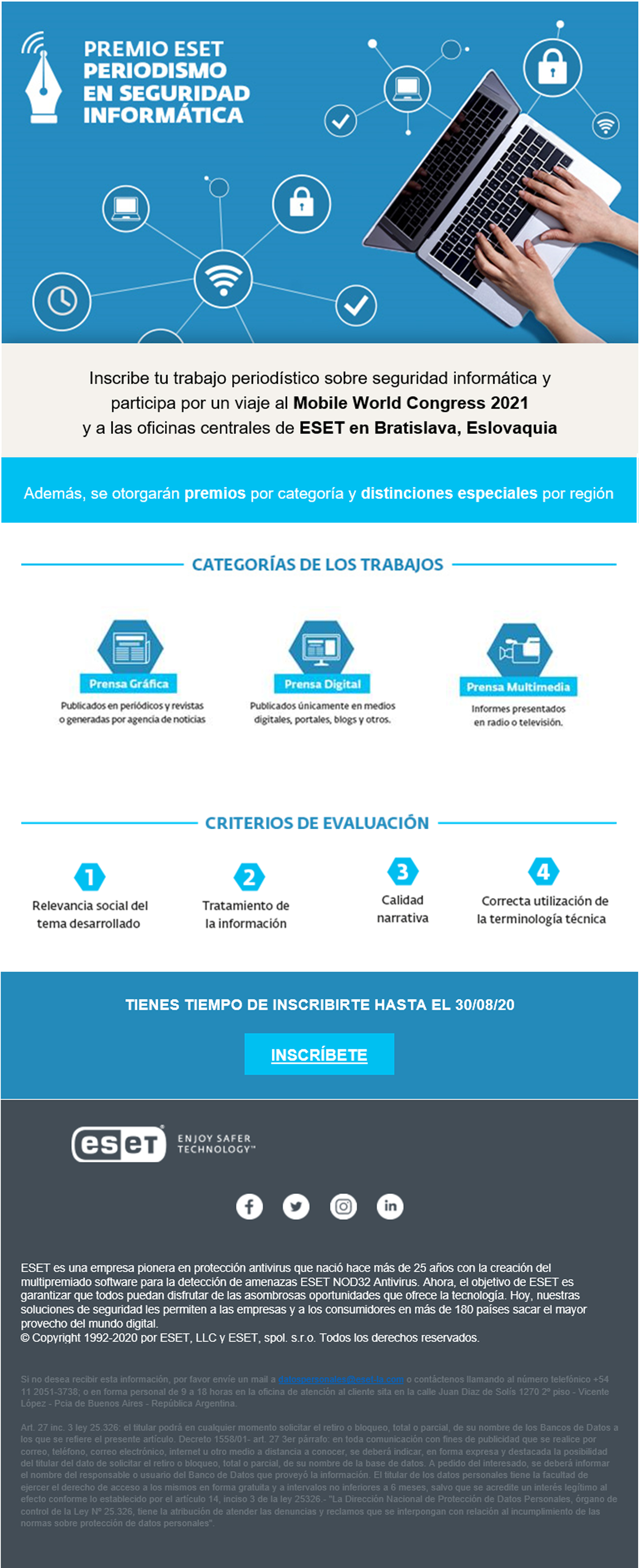 Buenos Aires, 10 de agosto de 2020 – ESET, compañía líder en detección proactiva de amenazas, anuncia que continúa abierta la inscripción para participar del Premio ESET al Periodismo en Seguridad Informática. Pueden concursar periodistas de Latinoamérica con notas relacionadas a la temática del certamen, publicadas en medios de la región entre el 31 de agosto de 2019 hasta el cierre del concurso, pautado para el 30 de agosto de 2020.