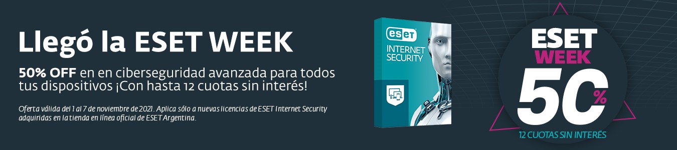 Del 1 al 7 de noviembre se celebrará la ESET WEEK en Argentina con 50% de descuento en la compra o renovación de la solución ESET Internet Security. Para obtener más información sobre todas las nuevas funciones y mejoras que vienen en la última versión de la oferta de ESET para usuarios hogareños, diríjase a: ESET NOD32, ESET Internet Security o ESET Smart Security Premium.