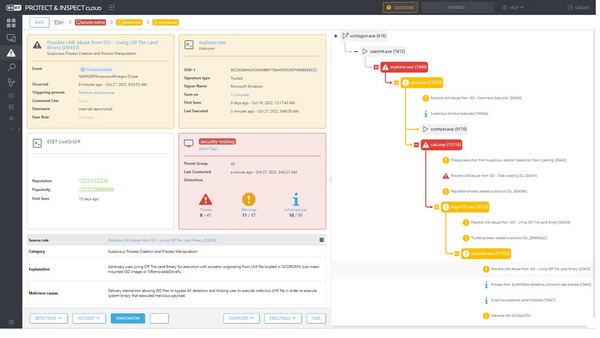 Para ayudar a dar sentido a todos estos datos, un producto de detección y respuesta viene con reglas para señalar eventos específicos, o secuencias de eventos, que son sospechosos o dignos de monitoreo. Dado que nuestra solución EDR puede conectarse con el sistema ESET LiveGrid, los ingenieros de seguridad de ESET han perfeccionado las reglas de ESET Inspect para tener en cuenta la reputación y popularidad de los ejecutables cuando sea relevante.