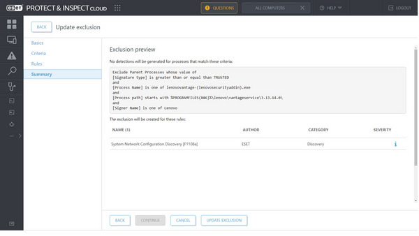 Aquí la exclusión sólo se aplica a la versión 3.13.14.0 del Servicio Lenovo Vantage, pero podría recortar el número de versión al final de la ruta del proceso para excluir todas las versiones. Esta decisión se centra en el equilibrio entre riesgo y ruido, una elección que debe repetirse constantemente durante el tiempo que utilice cualquier consola EDR.