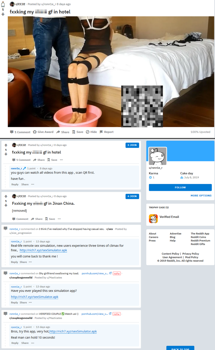 Android/Filecoder.C en azından 12 Temmuz 2019'dan beri faaliyette. Keşfettiğimiz kampanyada, Android/Filecoder.C, Reddit ve Android geliştiricileri için “XDA Developers” forumlarında dağıtıldı. Zararlı etkinliği XDA Geliştiricileri ve Reddit'e bildirdik. XDA Geliştiricileri forumundaki yazılar hızlı bir şekilde kaldırıldı; zararlıyı yayan Reddit profili ise yazı yayınlandığı sırada hala devam ediyordu.