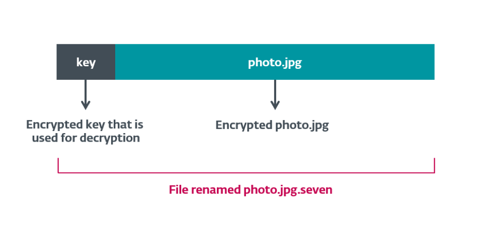 Dosyaları şifreleyince, fidye yazılımı şifrelenecek her dosya için yeni bir AES anahtarı oluşturur. Bu AES anahtarı daha sonra ortak anahtar kullanılarak şifrelenir ve şifreli her dosya için hazırlanır ve aşağıdaki şekilde sonuçlanır: ( (AES)public_key + (File)AES ).seven