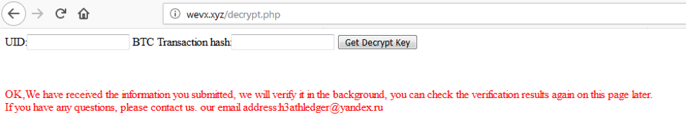 Dosyaların şifresini çözmek için gereken kod fidye yazılımı içinde bulunur. Eğer mağdur fidyeyi öderse, fidye yazılımı operatörü bunu Şekil 12’de gösterilen web sitesi aracılığıyla doğrulayabilir ve dosyaların şifresini çözmek için özel anahtarı gönderebilir.