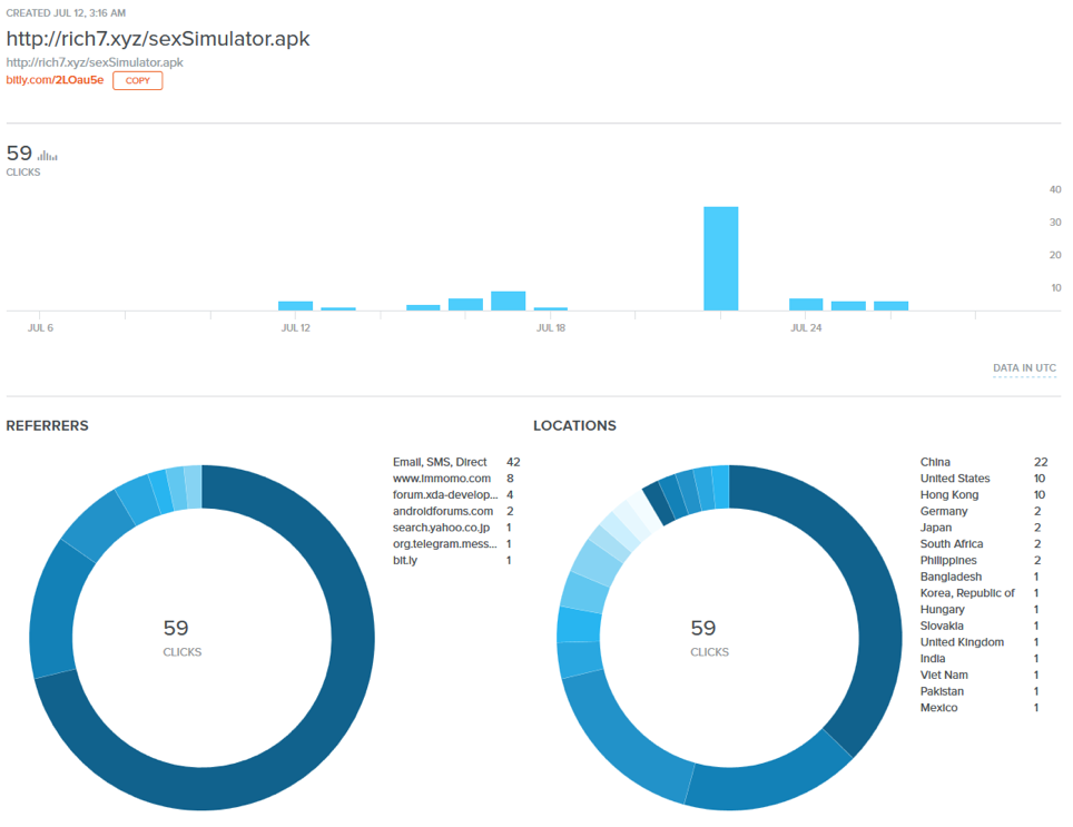 Reddit'te paylaşılan bir bağlantıda, saldırganlar URL kısaltıcı bit.ly kullandı. Bu bit.ly bağlantısı, 11 Haziran 2019 tarihinde oluşturuldu ve Şekil 3'te görüldüğü gibi, farklı kaynaklardan ve ülkelerden 59 tıklamaya ulaştığını gösteriyor.