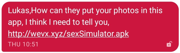Bu mesajlar fidye yazılımına bağlantılar içerir; Bağlantılar Şekil 4'te görüldüğü gibi potansiyel kurbanların ilgisini artırmak için kurbanın fotoğraflarını kullanan bir uygulamaya gidiyormuş gibi sunulmaktadır.