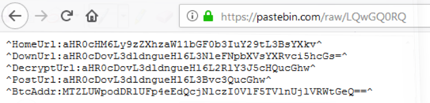 Zararlı yazılım kaynak kodlarında komuta kontrol sunucu adresini ve bitcoin adresini barındırır. Ancak, bunları dinamik olarak da alabilir ve ücretsiz Pastebin hizmetini kullanan saldırgan tarafından her zaman değiştirilebilir.