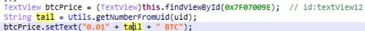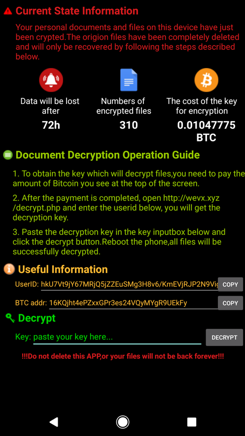 Bu benzersiz uygulama, gelen ödemelerin belirlenmesi için kullanılıyor olabilir. (Android fidye yazılımında, bu genellikle şifrelenmiş her cihaz için ayrı bir Bitcoin cüzdanı üretilerek elde edilir.) Bitcoin başına yaklaşık 9,400 ABD Doları tutarındaki son döviz kuruna dayanarak, türetilen fidye 94-188 ABD Doları aralığında olacaktır. Benzersiz kimlik rastgele oluşturulur).