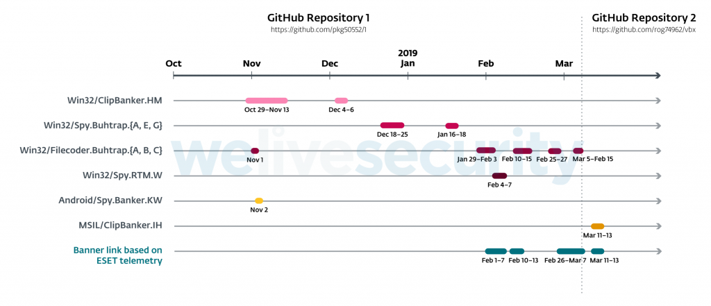 Bu zararlı yazılım kampanyası Ekim 2018'de başladı ve bu makale kaleme alındığı tarihte hala aktifti. Tüm depo GitHub'da herkese açık olduğundan, dağıtılan kötü amaçlı yazılım ailelerinin kesin bir zaman çizelgesini çizebildik (bkzŞekil 2). Bu dönemde GitHub'da barındırılan altı farklı kötü amaçlı yazılım ailesi gözlemledik. GitHub geçmişiyle karşılaştırmak için, ESET uzaktan ölçüm bilgilerine dayalı banner bağlantılarının ne zaman görüldüğünü gösteren bir satır ekledik. Yüklerin GitHub'da mevcut olduğu anlarla oldukça iyi ilişkili olduğunu görebiliyoruz. Şubat ayının sonundaki tutarsızlık, geçmişteki bir bölümden yoksun olma ihtimali ile açıklanabilir. Çünkü depo, biz hepsini alamadan GitHub'dan kaldırıldı.