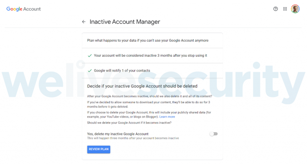 Önemli bilgilerinizin erişilemez hale gelmesini önlemek için Google’ın Etkin Olmayan Hesap Yöneticisi’ni etkileştirebilirsiniz. Google böylece hesabınızın aktif olmadığını tespit edip daha önce seçmiş olduğunuz bir irtibat kişisine indirilebilir bir bağlantı göndermektedir. Tıpkı hangi verilerinizin indirilebileceğini seçebileceğiniz gibi hesabınızın aktif olmayacağı süreyi de siz seçersiniz.