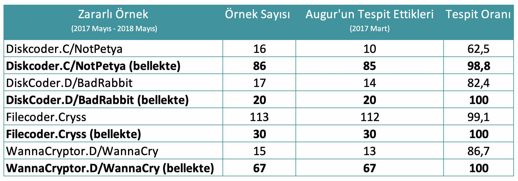 Sonuçlar, Augur sürümünün zararlı örneklerden daha eski olmasına rağmen, dosya algılama oranının yüksek, bazı durumlarda kusursuzluğa yakın olduğunu göstermektedir. Bununla birlikte, kurumlar için en önemli nokta, Augur'un enfekte olmuş cihazın hafızasında çalıştırıldığı sırada numunenin zararlı yapısını doğru bir şekilde tanımlayabilmesidir. Bu, yetkililere, şirket altyapısında büyük hasara yol açmadan tehdidi durdurma şansı sağlayacaktır.