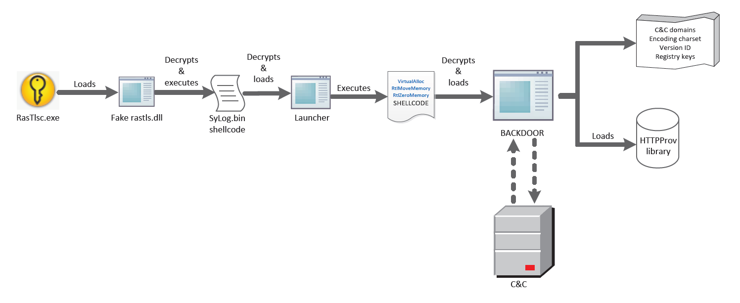 Arka kapıyı bir makineye yerleştirmek için, grup iki aşamalı bir saldırı kullanır, öncelikle bir yerleştirici paketi sistemde dayanak noktası kazanır ve arka kapının kendisi için zemin oluşturur. Bu süreç, bu tür hedeflenen operasyonlarla yaygın olarak ilişkili bazı hileleri içerir.