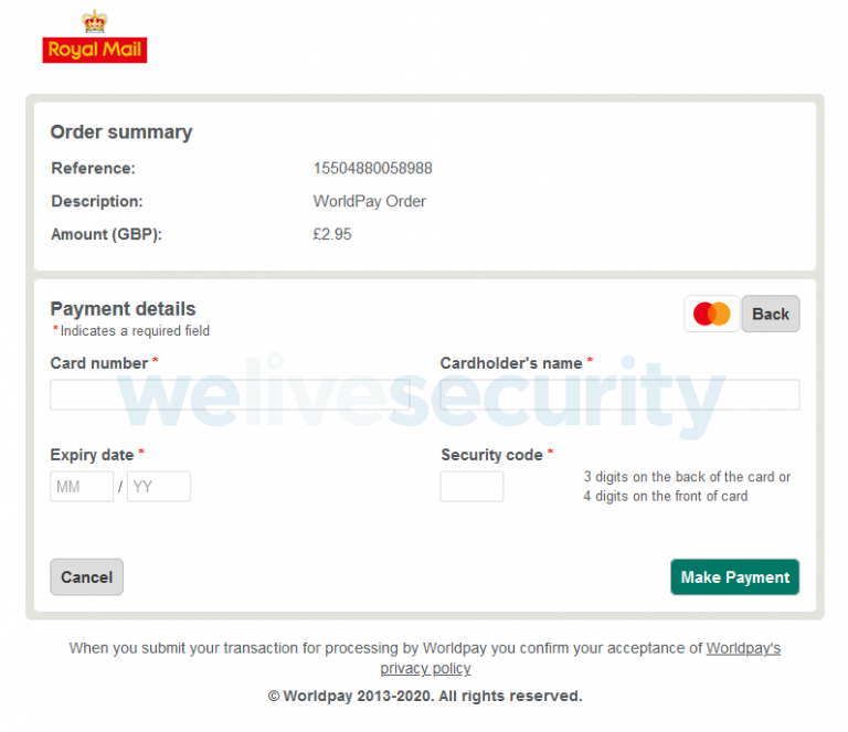 Bu bilgileri girdikten sonra ödeme ayrıntılarına ilerleyebildim. Tüm bu bilgileri girdikten sonra, kargonun “teslim edilmesi” için küçük bir ücret (2,95£) ödemesi ekrana geldi ve kredi kartı bilgilerimi girmem gerekiyordu. Bu alanı sahte bilgilerle doldurmak istedim ancak başarılı olamadım çünkü satırları doğru bir şekilde doldurmadan diğer sayfaya geçemedim. Örneğin kredi kartı numarasının mutlaka 16 haneli bir sayı olması gerekiyordu. Ancak, daha sonra ele geçirilmiş ve bu dolandırıcılıkta kullanılan gerçek bir internet sitesine yönlendirildiğimi fark ettim. Site yöneticilerini bilgilendirdim ve site şu an kapalı durumda.