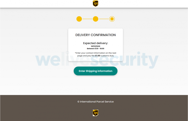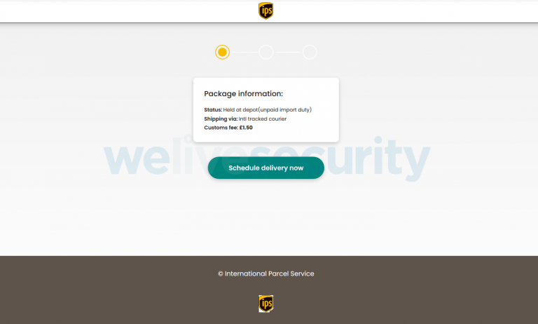 Ücretin de gösterildiği ilk sayfada bir teslimat günü belirlemem istendi. Sanal özel ağımı (VPN) kullanarak, başka bir ülkedeymiş gibi bu sayfayı ziyaret etmeye çalıştım, ancak bağlantıya yalnızca Birleşik Krallık'tan giriş yapılabildiği fak ettim. Bu durum bu kimlik avının pek de karmaşık olmadığının bir işaretiydi. Daha yakından incelediğimde sahtekarların UPS yerine “IPS” şirket ismini kullandığını ancak logoyu kopyalamak için zaman harcadıklarını gördüm. Peki neden doğru logoyu kullanmıyorlar? Telif hakkı gibi bir durumdan çekinmedikleri kesin.