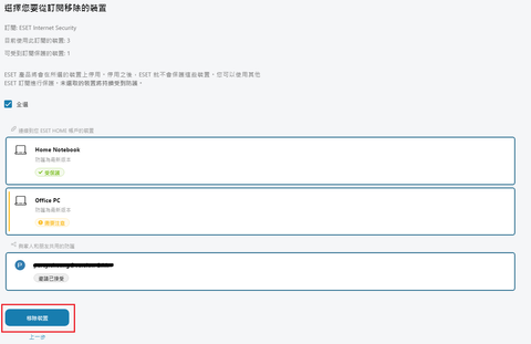 6. 選擇你需要跟授權斷開連接的裝置,或勾選「全選」,然後點擊「移除裝置」