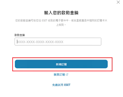 5. 輸入啟動金鑰 (可在紙盒內的卡找到) ,然後按「新增訂閱」。