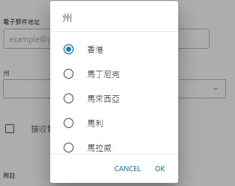 6. 填寫登記資料包括「名稱」、「姓氏」、「電子郵件地址」 及於「州」一項請選擇「香港」。
