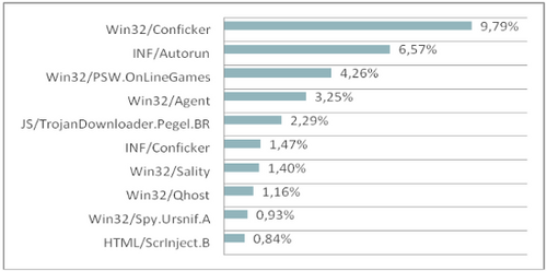 В июне семейство Conficker продолжает оставаться активным. Win32/Conficker который месяц удерживает пальму первенства среди вредоносного ПО в мировом (9,79 %) и украинском (19,42 %)рейтингах угроз. Этот сетевой червь распространяется при помощи уязвимости ОС Windows, которая находится в подсистеме вызова удаленных процедур (RPC), а также через незащищенные общедоступные папки и съемные носители информации. Также широкораспространенной остается угроза INF/Conficker - еще один представитель известного семейства. Используя файл autorun.inf, эта вредоносная программа распространяет последние вариации червя Conficker для заражения ПК. Большое количество зараженных компьютеров по всему миру и в Украине в том числе (1,47 % и 1,66 % соответственно) обеспечивает данной угрозе лидирущие позиции в рейтингах вредоносного ПО.