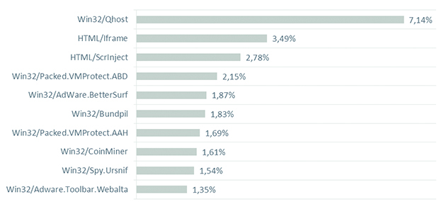 По словам специалистов ESET, наряду с вышеописанными угрозами, активными продолжают оставаться такие вредоносные программы как HTML/Iframe, Win32/CoinMiner, Win32/Spy.Ursnif, Win32/Packed.VMProtect.AAH и Win32/Packed.VMProtect.ABD, которые также предоставляют доступ киберпреступникам к зараженному компьютеру и воруют конфиденциальную информацию. Также данные вредоносные программы могут генерировать произвольные комментарии или создавать скрытые учетные записи пользователя системы, что значительно усложняет возможность их обнаружения антивирусными решениями.