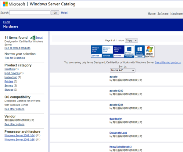 The Chinese company’s certified products listed in the Windows Server Catalog