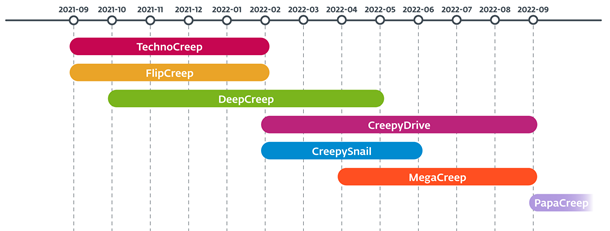 - According to ESET telemetry, the group has used at least seven different custom backdoors since September 2021, with its most recent actions observed as recently as September 2022. ESET named the five previously undocumented backdoors with the suffix “-Creep.”
