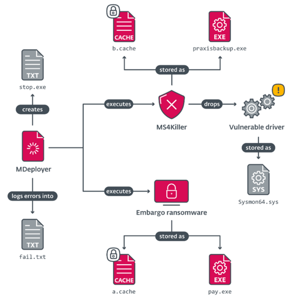 With MDeployer, the Embargo threat actor abuses Safe Mode to disable security solutions. MS4Killer is a typical defence evasion tool that terminates security product processes using the technique known as Bring Your Own Vulnerable Driver (BYOVD). In this technique, the threat actor abuses signed, vulnerable kernel drivers to gain kernel-level code execution. Ransomware affiliates often incorporate BYOVD tooling in their compromise chain to tamper with security solutions protecting the infrastructure being attacked. After disabling the security software, affiliates can run the ransomware payload without worrying whether their payload gets detected.