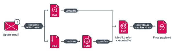 Emails from all campaigns contained a malicious attachment that the potential victim was incentivised to open, based on the text of the email. The file itself was either an ISO file or archive with the ModiLoader executable. ModiLoader is a Delphi downloader with a simple task – to download and launch malware. In two of the campaigns, ModiLoader samples were configured to download the next-stage malware from a compromised server belonging to a Hungarian company. In the rest of the campaigns, ModiLoader downloaded the next stage from Microsoft’s OneDrive cloud storage.