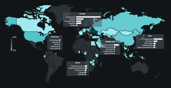 Iran-aligned groups, on the other hand, compromised several financial services firms in Africa – a continent geopolitically important to Iran, conducted cyberespionage against Iraq and Azerbaijan, neighboring countries with which Iran has complex relationships, and increased their stake in the transport sector in Israel. Despite this seemingly narrow geographical targeting, Iran-aligned groups maintained a global focus, further pursuing diplomatic envoys in France and educational organizations in the United States.