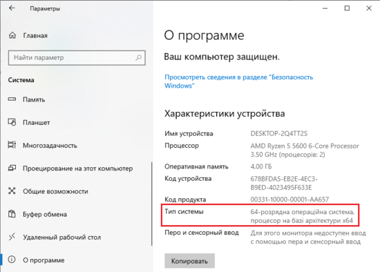 Откройте меню пуск (в левом нижнем углу экрана), выберите пункт «Параметры», после чего в новом окне выберите «Система» → «О системе», где будет пункт «Тип системы»: