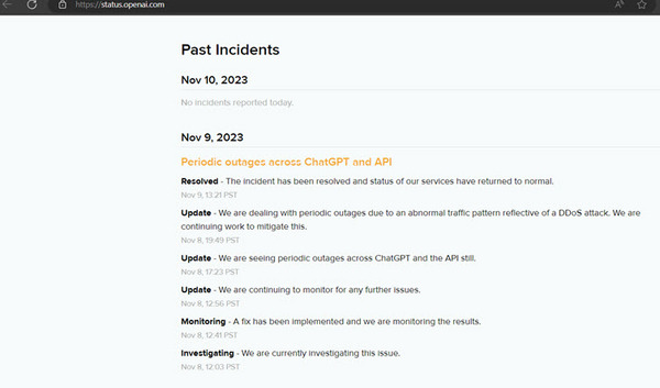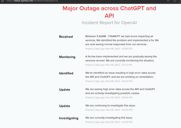Registro de incidentes de OpenIA donde se reporta la vuelta a la normalidad el 9 de noviembre