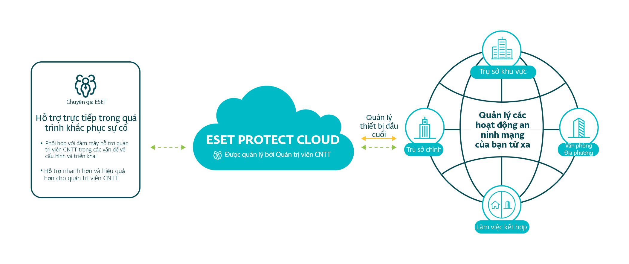 One-stop shop của bạn đảm bảo tất cả các nhu cầu bảo mật cá nhân. Từ việc triển khai đến bảo trì phần mềm máy khách ESET, chúng tôi luôn sẵn sàng hỗ trợ bạn. Thông qua cơ sở hạ tầng đám mây của chúng tôi, bạn có thể quản lý và thực hiện các tác vụ một cách thuận tiện từ trình duyệt web của mình.