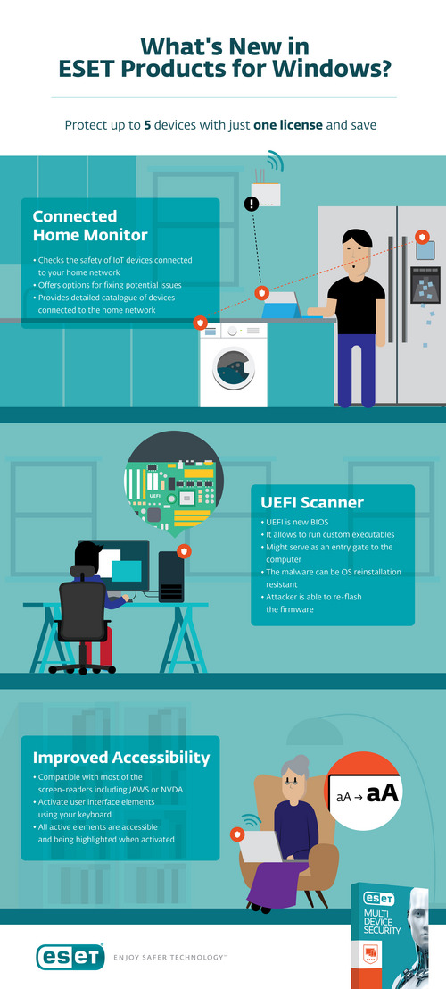 Built using three decades of progress in IT security, the flagship products provide protection beyond the dimension of the operating system. Its new layer of security is active before Windows starts running and seeks any threat planted in the Unified Extensible Firmware Interface (UEFI), which can be abused by cyber criminals to compromise its various components in order to gain access to a victim’s data. The new line is ideal for connected households with a new feature that keeps all of the smart devices that connect to a home network safe at one place, fully embracing the Internet of Things trend. Lastly, the re-invented license manager keeps users minds worry free, as all the important data is available at one click at my.eset.com.